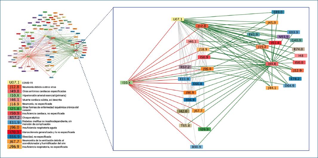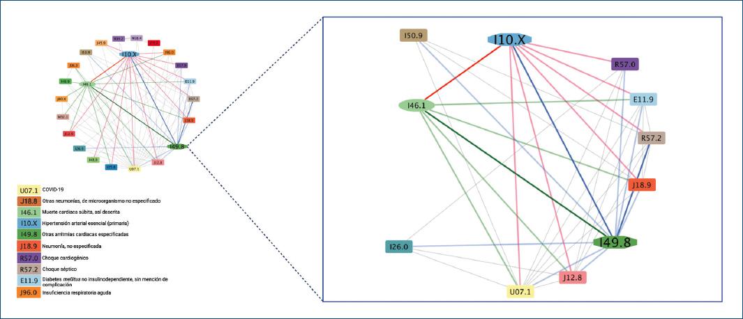 En la red de casos de mortalidad (Fig. 4) se destacan las conexiones directas con los eventos catastróficos que contribuyeron al desenlace, como el choque cardiogénico (R57.0) y la muerte cardiaca súbita, así descrita (I46.1), a la vez conectados con otras complicaciones respiratorias como neumonía debida a otros virus (J12.8) o la neumonía no especificada (J18.9).