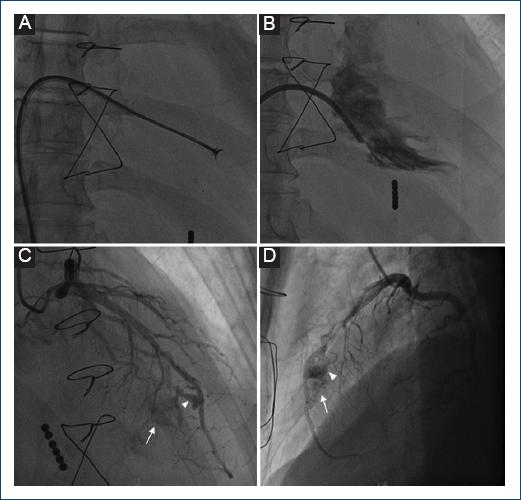 Figura 1 A: toma de biopsia endomiocárdica (BEM) en septum de ventrículo derecho (apical y medio). B: ventriculografía posbiopsia. C y D: angiografía coronaria invasiva (ACI) en el año 2013. Dos pequeños aneurismas (puntas de flecha) de dimensiones 5.9 x 2.8 y 3.1 x 1.5 mm sobre arteria descendente anterior y fístula coronaria (flecha) que comunica sus ramos septales con el ventrículo derecho.