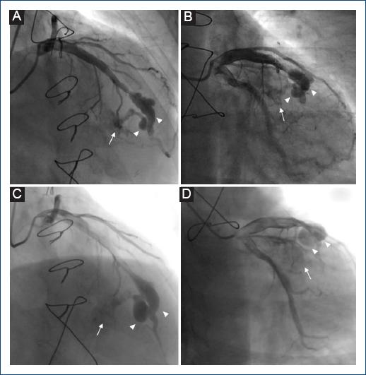 Figura 2 A y B: angiografía coronaria invasiva (ACI) en el año 2017. Aneurismas (puntas de flecha) de dimensiones 20.6 x 7.6 mm y 7.2 x 4.5 mm sobre arteria descendente anterior y fístula coronaria (flecha) que comunica sus ramos septales con el ventrículo derecho. C y D: angiografía coronaria invasiva (ACI) en el año 2023. Aneurismas (puntas de flecha) de dimensiones 21.5 x 7.9 mm y 14.9 x 8.8 mm sobre arteria descendente anterior y fístula coronaria (flecha) que comunica sus ramos septales con el ventrículo derecho.