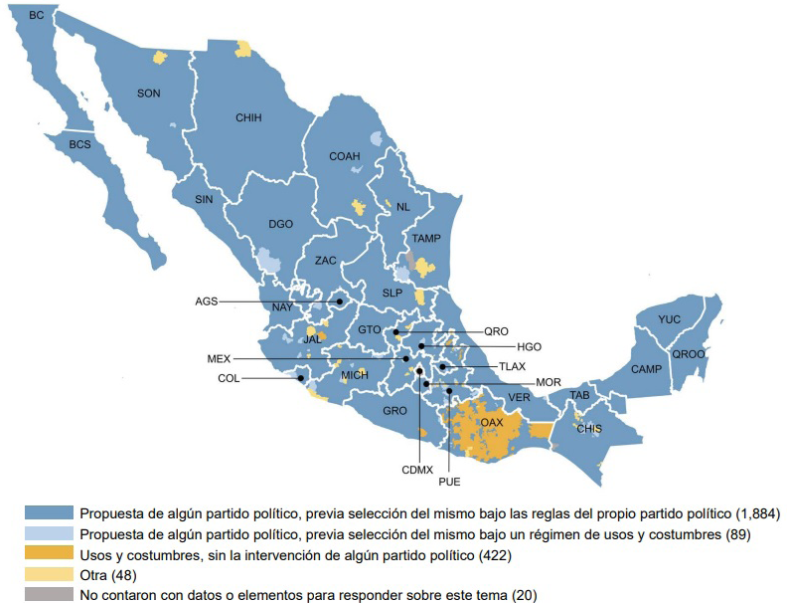 En este sentido, la población hablante de alguna lengua indígena en el país representa el 6.1% al sumar 7’364,645 personas (INEGI, 2022). Ésta se agrupa en 17 de las 32 entidades federativas del país, y que cuentan con municipios indígenas,5 donde destaca Oaxaca al tener 293 (Senado de la República, 2021b) que tienen como característica la forma de elección por sistemas normativos internos, lo que implica la nula participación de partidos políticos. Esta característica se destaca en el siguiente Mapa.