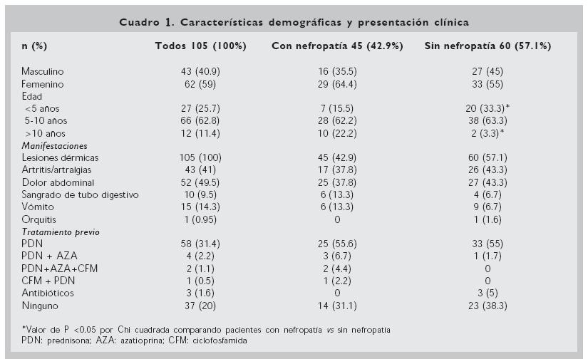 Resultados. Se encontraron 105 pacientes con una mediana de edad de 6 años. El tiempo promedio de seguimiento fue de 15 meses. Todos presentaron lesiones dérmicas, 49.5% dolor abdominal y 41% artritis; 45 (42.9%) pacientes manifestaron nefropatía, con un promedio de aparición de 4.5 meses después de las lesiones dérmicas. Sólo en 37.7% de los casos con nefropatía desaparecieron las alteraciones urinarias. Se realizó biopsia renal en 14 pacientes. La lesión histopatológica más frecuente fue el grado IIIA. La edad de presentación tuvo relación estadísticamente significativa con la presencia de nefritis, los mayores de 10 años tuvieron mayor incidencia de nefritis y los menores de 5 años menor incidencia (Chi cuadrada, P < 0.05). La incidencia global de insuficiencia renal crónica fue de 0.95%.