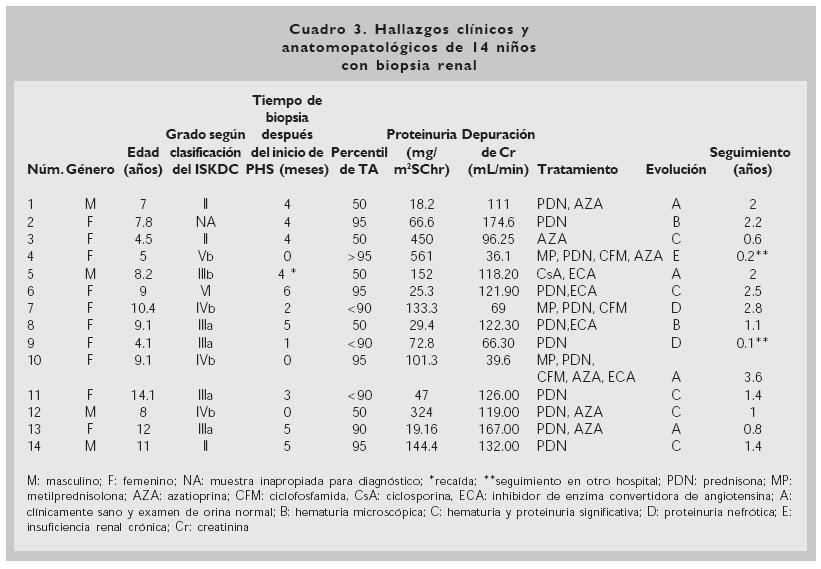 De 14 pacientes, en quienes se realizó biopsia renal, la lesión histológica más frecuente fue la proliferación mesangial con proliferación extracapilar en menos de 50% de los glomérulos (grado IIIa) que se encontró en 4/14 pacientes (30.7%), y continúa siendo similar a lo reportado por Mota y col.15 en 1975, quienes encontraron que 19/52 (36%) pacientes con nefritis por PHS y biopsia renal tuvieron grado IIIa.