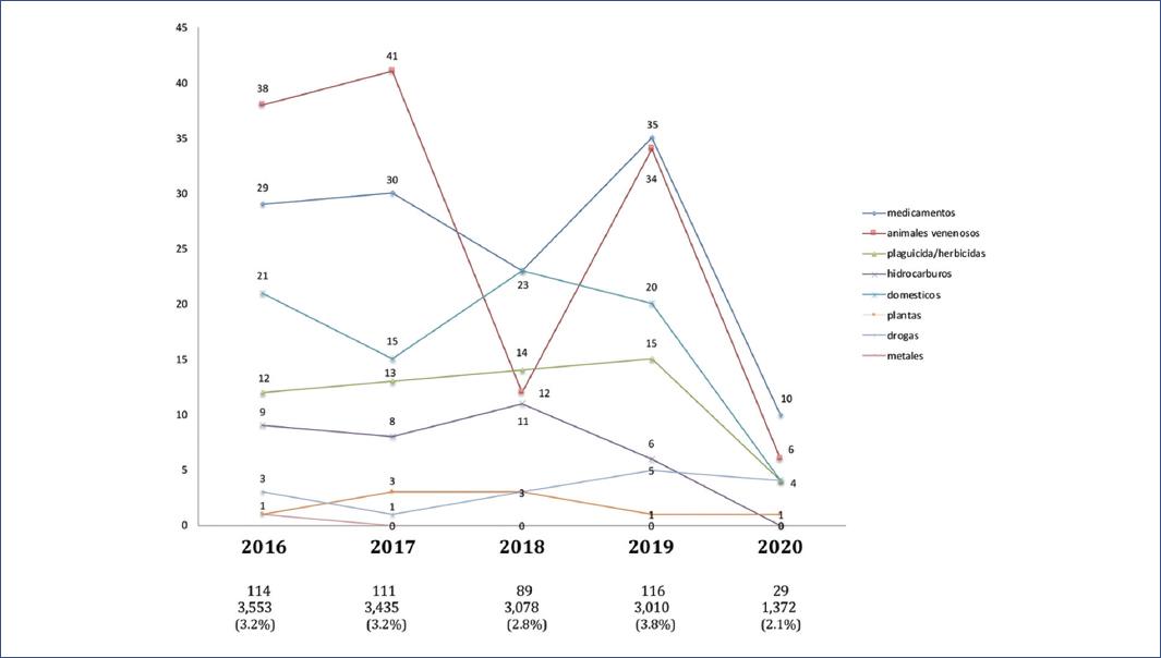 Estudio transversal retrospectivo analítico de los pacientes de 0 a 16 años atendidos en el área de urgencias de pediatría de un hospital en el Occidente de México por algún tipo de contacto con un xenobiótico, de enero de 2016 a diciembre de 2020. Esta unidad hospitalaria atiende a la población de Guadalajara y su zona metropolitana, compuesta por otros cinco municipios (Zapopan, El Salto, Tlaquepaque, Tonalá y Tlajomulco) de Jalisco. Se incluyeron en el análisis todos los menores de 16 años que acudieron por algún tipo de envenenamiento. Para obtener la información se revisaron las hojas de registro de todos los pacientes y se obtuvieron los datos del expediente electrónico de cada paciente: sexo, edad, fecha de ingreso, motivo de consulta, agente xenobiótico (animal, sustancia química, planta) característica del contacto con el agente (accidental, intencional, recreativa o intento de suicidio), zona de exposición (oral, cutánea, inhalado), diagnóstico y calidad de egreso (vivo o defunción). Los xenobióticos se dividieron en ocho categorías: ingesta de medicamentos, picadura o mordedura de animal venenoso, contacto con plaguicidas o herbicidas, ingesta de hidrocarburos, ingesta de productos de uso doméstico, contacto con plantas, uso de drogas adictivas o estimulantes, e ingesta de metales.