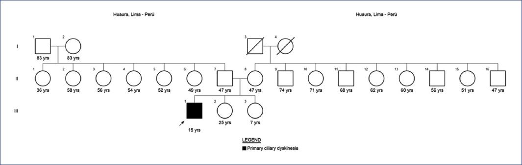 Se presenta el caso de un paciente de sexo masculino de 15 años que acudió a consulta por tos húmeda crónica con expectoración verdosa, disnea con moderados esfuerzos (escala de disnea modificada del British Medical Research Council grado 2) y disminución de la actividad física. El paciente nació a término por parto eutócico con 39 semanas (segunda gestación), peso al nacer 3300 g y APGAR 81-95, sin complicaciones durante el parto. A las horas de nacido presentó dificultad respiratoria y fue diagnosticado de neumonía neonatal, requirió ventilación mecánica por 8 días y fue dado de alta a los 15 días de vida. Sus padres no tienen consanguinidad ni antecedentes familiares de patologías respiratorias (Fig. 1).
