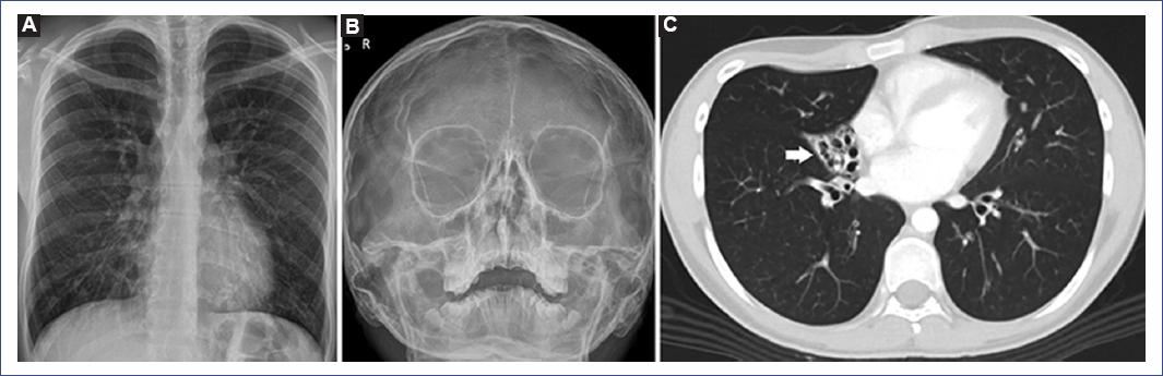 Los estudios radiológicos mostraron opacidad paracardiaca derecha que borraba parcialmente el borde cardiaco derecho y refuerzo de la trama broncovascular bilateral (Fig. 2A), alteración de los senos paranasales (Fig. 2B), bronquiectasias quísticas del lóbulo medio (Fig. 2C) y bronquiectasias cilíndricas en ambos lóbulos inferiores.
