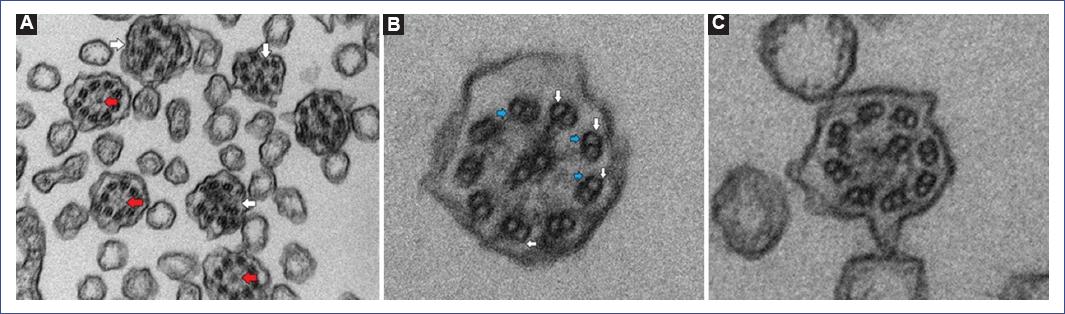 Figura 3 Microscopía electrónica de transmisión. A: en varias secciones transversales ciliares se observan desorganización microtubular (flechas blancas) y ausencia del par de microtúbulos centrales 9 + 0 (flechas rojas) (aumento × 60.000). B: corte transversal de cilio respiratorio en el que se observa que la mayor parte de los microtúbulos periféricos muestran ausencia de los brazos internos (flechas azul celeste) y externos (flechas blancas) de dineína (aumento × 85.000). C: corte transversal de cilio respiratorio en el que se observa una organización microtubular alterada 8 + 2, con ausencia de uno de los microtúbulos periféricos y desplazamiento del par central. La mayor parte de los microtúbulos periféricos muestran ausencia de los brazos internos y externos de dineína (aumento × 85.000).