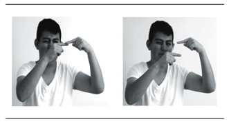 - Matriz de rasgos no manuales (RNM): Está formada por rasgos que dan cuenta de las expresiones de la cara, movimientos de la boca, nariz, cejas, ojos, o posturas del cuerpo articulados significativamente y que junto con la actividad de las manos constituyen las señas.