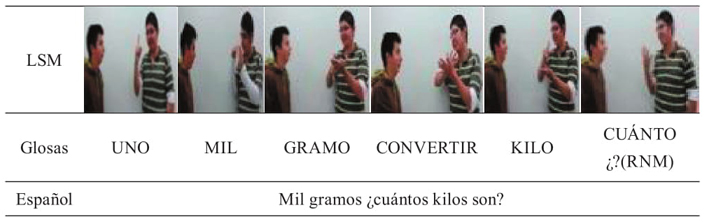 Para la transcripción de esta lengua, en esta investigación entendemos que “Una transcripción es un sistema de notación, que implica no sólo la descripción de la configuración de la mano, sino de todos los elementos lingüísticos que están presentes en la deixis espacial, o el uso de los rasgos no manuales...” (Cruz-Aldrete, 2008, p. 94). Y se ha empleado un sistema de glosas2. Las glosas reflejan tanto los componentes manuales de la LSM como las expresiones faciales y corporales que aparecen en cada una de las producciones en señas que se usan para marcar las modalidades interrogativas, negativas, afirmativas, dubitativas y exclamativas. Para representar la transcripción de las señas se usaron palabras del español transcritas en mayúsculas. Por ejemplo, si en una transcripción en glosa leemos: UNO-MIL-GRAMO-CONVERTIR-KILO-CUÁNTO, la interpretación al español no es un mil gramo convertir kilo cuanto sino Mil gramos ¿Cuántos kilos son? (véase Figura 2).