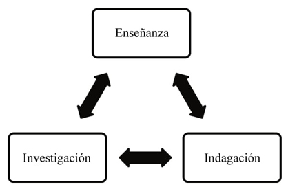 Con los ocho jóvenes sordos se formaron dos grupos, cada uno de cuatro estudiantes, en el primer grupo se trataron las nociones de cantidad de longitud ─no se incluye en este estudio─ y en el segundo, las nociones de cantidad de peso. Las actividades diseñadas sobre el uso y comunicación de señas para las nociones en foco, se realizaron durante sesenta sesiones de cuatro horas, alternas, cada quince días, en el desarrollo de tres procesos de investigación en condiciones de tiempo real en el aula: (1) enseñanza de las nociones en foco a cada grupo; (2) indagación o comunicación entre pares, con el segundo grupo, para identificar los niveles de competencia lingüística y comunicativa, bajo la estrategia de comunicación entre pares, para observar el uso de la LSM y de las señas propuestas de las nociones adquiridas, así como para informar de la comprensión de mensajes con contenidos matemáticos; (3) investigación, en Cámara Gessell, que consistió en la aplicación de entrevistas individuales sobre las nociones en cuestión, con un guion en LSM. La Figura 4 muestra el modelo de los tres procesos de la investigación en el aula.