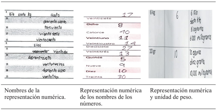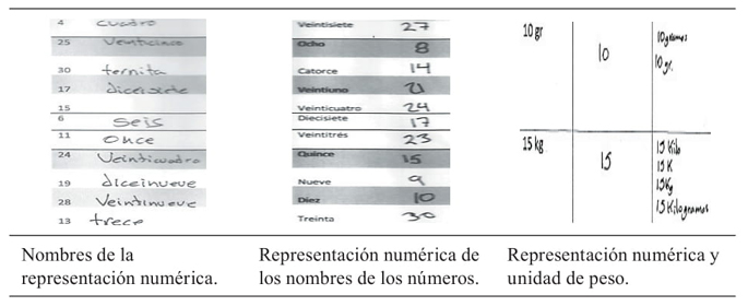 Se aplicaron tres instrumentos en expresión escrita. El primero, nombres de la representación numérica, el segundo, representación numérica de los nombres de los números y el tercero, representación numérica y unidad de peso.