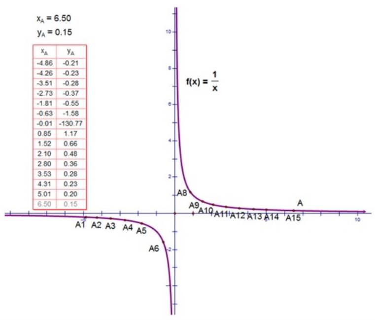 A Figura 1 ilustra um potencial conflito ao nível da interface (limitação da janela de visualização do gráfico) no gráfico de f(x)=1/x. Conforme varia-se um ponto dinâmico associado à variável em x e observa-se o comportamento de um ponto associado à variável em y, que some na área inferior do gráfico e logo reaparece no topo, pode ser gerada a impressão de uma conexão entre valores de y que tendem a -∞ e a +∞, sem uma quebra da continuidade em x = 0.