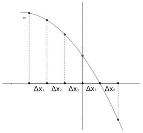Uma dificuldade importante surgiu na interpretação da variação negativa, ou seja, a variação cujo valor é negativo (Δy < 0) a depender dos incrementos e das diferenças resultantes nos valores das variáveis. Na situação 1, ao abordar a função quadrática m(x) (Figura 9) cujas variáveis foram representadas por segmentos dinâmicos nos eixos x e y, sem acesso visual ao gráfico, Louise descreveu a variável m(x) como aumentando a sua variação conforme x crescia, embora tal variação fosse, pelo contrário, decrescente: