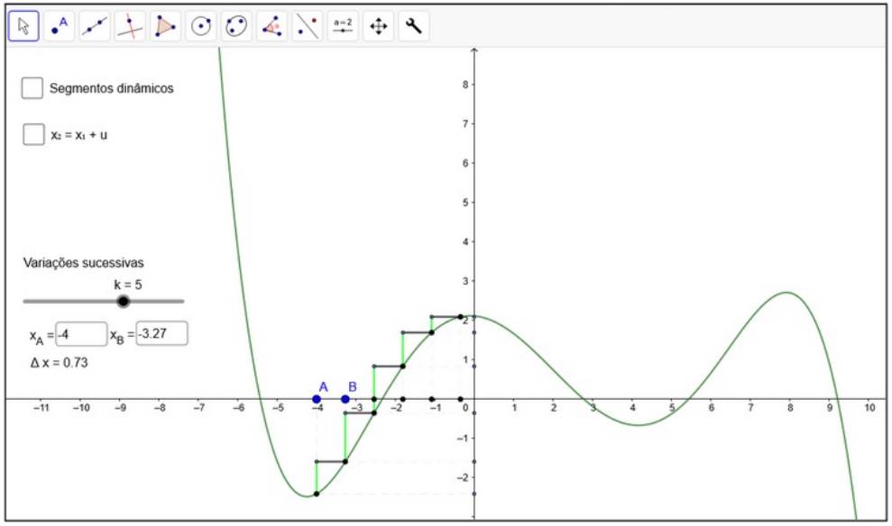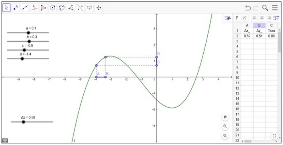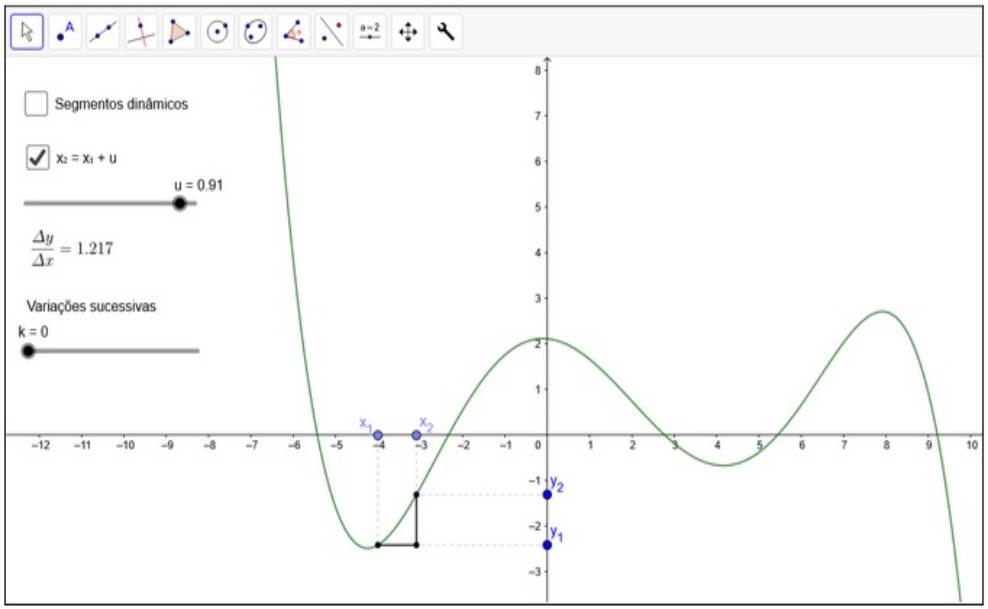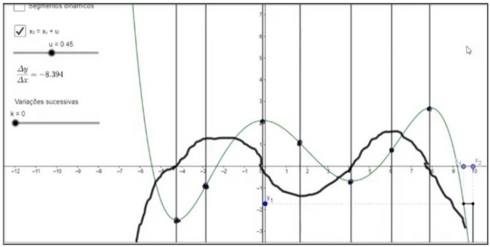 Além disso, o meio computacional permite explorar a covariação por meio de diferentes representações de função conectadas. Como exemplo, Lagrange (2014), Lagrange e Psycharis (2014) e Ellis et al. (2016) destacaram o suporte de aspectos computacionais como a variação dinâmica e a conexão simultânea entre diferentes representações. Por outro lado, a infraestrutura da geometria dinâmica também traz restrições, como a possibilidade de associação entre objetos de naturezas distintas e das suas propriedades, podendo gerar equívocos, como o da associação do valor da variação Δy entre f(x 1 ) e f(x 2 ) com a distância entre os pontos que representam f(x 1 ) e f(x 2 ), a qual não assume valores negativos. Um conflito pode surgir com o conceito de variável ao deslizar o ponto associado à variável e construir uma ideia de um objeto único que se move no eixo em vez de um objeto representativo de um conjunto de valores; outro conflito da mesma natureza com a representação de retas e segmentos secantes e tangentes comuns na representação da taxa de variação (Zengin, 2018; Ndlovu et al., 2011).
