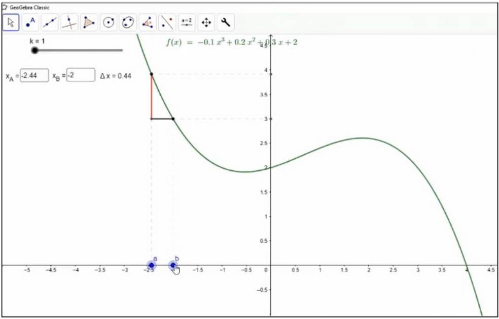 A possibilidade do GeoGebra de permitir a conexão simultânea entre o gráfico e as ferramentas descritas acima permitiu aos estudantes o uso instrumentado dessas ferramentas para interpretar os seguintes aspectos do gráfico por uma coordenação da covariação contínua: intervalos de crescimento e decrescimento, concavidades, pontos de máximo, mínimo e inflexão.