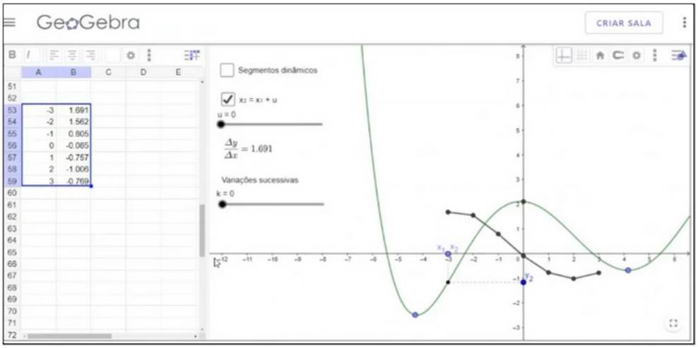 Alice (situação 2): (Varia xA e xB próximo aos valores do xMIN. Repete o procedimento algumas vezes, nos dois sentidos. Observa a variação de Δy na caixa de texto que exibe o valor de Δy). Deixa eu ver mais o quê... os pontos de máximo e mínimo… No ponto de... nesse ponto de mínimo, ele... Se aproxima, né? Se aproxima de zero no ponto de mínimo, e por aqui acontece a mudança de sinal. Ele vem crescendo, só que com o sinal negativo e mais ou menos por aqui tem essa mudança de sinal. Continua crescendo só que o sinal se altera e passa a ser positivo. Então eu diria que esse ponto de mínimo é o responsável por alterar o sinal dessa variação … (Silva, 2022, p. 239)