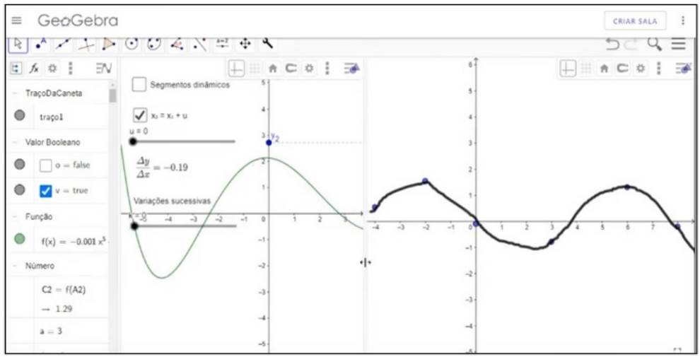 Também foi destacado o papel das ferramentas que permitiram a coordenação da covariação contínua, como a ferramenta de variação dinâmica entre Δx e Δy. Ao conectar dois valores da variável em x com os respectivos valores em y e permitir a variação dinâmica destes valores, esta ferramenta permitiu um suporte à coordenação dos valores de Δx e Δy, com Δx fixo. O papel da variação dinâmica e da conexão simultânea das representações foi um princípio de design fundamental em todos os materiais concebidos neste estudo. Tais características permitiram explorar os aspectos da covariação revelados por cada representação, interpretar os aspectos da forma do gráfico covariacionalmente, construir relações entre o comportamento do gráfico da função e o gráfico da sua taxa de variação, bem como entre o modelo algébrico e a variação da função.