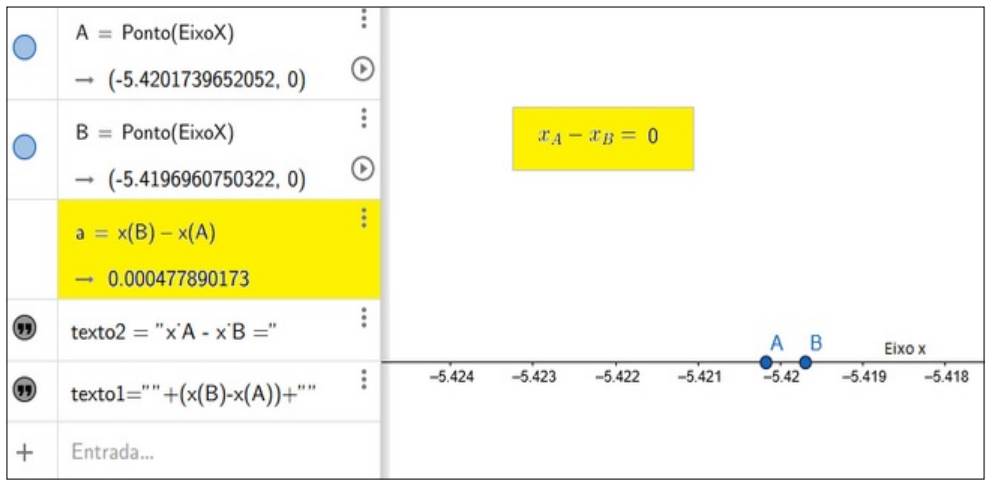 No contexto numérico, a natureza finita dos algoritmos computacionais (Giraldo et al., 2002) tem efeito nas limitações da interface, por exemplo, na exibição do valor da variação entre valores próximos o suficiente, pode ser exibido o valor zero como resultado caso o número de dígitos não seja configurado adequadamente (Figura 3); este conflito pode ser comum ao abordar a variação infinitesimal, na qual é importante a aproximação cada vez maior entre valores.