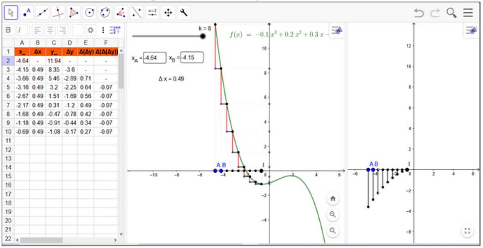 Eric (situação 2): (Retorna xA e xB a um pouco antes do x do ponto de inflexão e varia os valores até um pouco depois do x do ponto de inflexão. Observa a variação em Δy na planilha. Repete o procedimento duas vezes.) E aí tá nessa região aqui de mudança de concavidade. Começa a aumentar, aumentar... Então, onde tá aqui esse ponto, na mudança da concavidade, o Δy que estava diminuindo, ele passa a aumentar, ele começa a crescer. (Silva, 2022, p. 229)