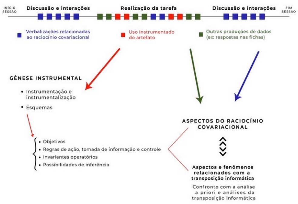 A noção de esquema de Vergnaud foi tomada neste estudo por fornecer uma estrutura analítica que permite relacionar os aspectos intencionais e gerativos envolvidos nas regras, objetivos e ações que os compõem com o conhecimento subjacente à ação instrumentada sobre o artefato. Assim, ao estruturar as ações e as interações dos estudantes com o GeoGebra por meio dos seus esquemas inferidos, buscamos identificar nesses esquemas o raciocínio covariacional subjacente a essas ações, complementando assim o raciocínio covariacional inferido mais diretamente, a partir das falas e respostas dos estudantes.