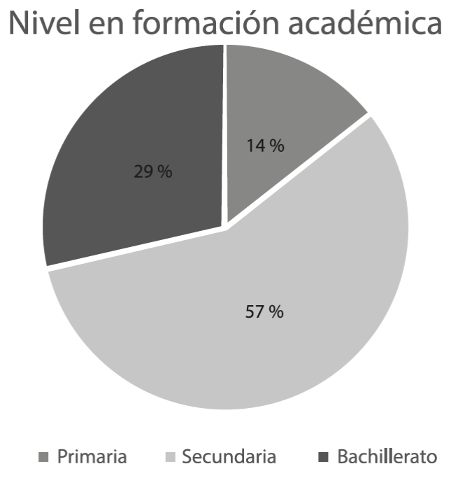 Todos los encuestados decidieron como primera opción estudiar Ingeniería Química por el perfil de la carrera y la vocación en experimentación o matemáticas, aunque el 75 % tenía al menos otras dos opciones de carrera. En un 25 % de los casos, se trataba de opciones en universidades privadas y en un 25 % de los casos, en carreras del área de humanidades o económico-administrativas. El nivel de estudios promedio en las familias de los estudiantes encuestados fue de secundaria con un 57 % y de nivel bachillerato y primaria de 29 % y 14 % respectivamente como se muestra en la Figura 2, por ello los ingresos dentro del hogar requieren apoyo por parte de los estudiantes y con ello la idea de que al conseguir un trabajo en el sector industrial mejoraría la estabilidad económica del hogar, al ver como una inversión el sacrificio actual el obtener el grado de licenciatura y no apostar la inversión para continuar en un posgrado.