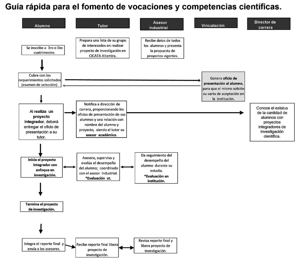 Los alumnos que llevaron a cabo este trabajo fueron invitados a participar en el proyecto de obtención de carbones activados, para evaluar la asignatura Integradora II. Los alumnos fueron identificados por la tutora de la Universidad como aquellos con curiosidad por realizar un trabajo con mayor trascendencia que “reciclar algún trabajo previo” o “realizar un experimento en el laboratorio escolar”, como manifestaron en el cuestionario final los alumnos. En la Figura 1 se muestra una guía rápida desarrollada para el proceso de selección y seguimiento de los alumnos invitados al ejercicio de observación participativa para el fomento de vocaciones y competencias científicas, seguido en CICATA Altamira y la Universidad Tecnológica de Altamira.