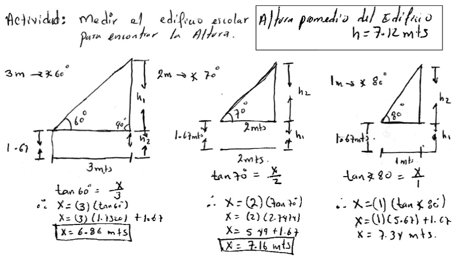 La investigación de Montiel y Jácome (2014) evidenció que en la escuela domina un tratamiento aritmético y algebraico de las razones trigonométricas, las nociones y representaciones geométricas incluidas en las tareas sirven de ilustraciones -porque no se construyen o se miden- de donde tomar los datos que se sustituyen en las fórmulas; los problemas que se gestan en este contexto son lo que estos autores denominaron como significado lineal: la concepción y tratamiento lineal de la relación entre ángulo y cateto en un triángulo rectángulo, por ejemplo, relacionando crecimientos constantes del ángulo -diez en diez grados- con decrecimientos constantes del cateto -uno en un metro- (Figura 2).