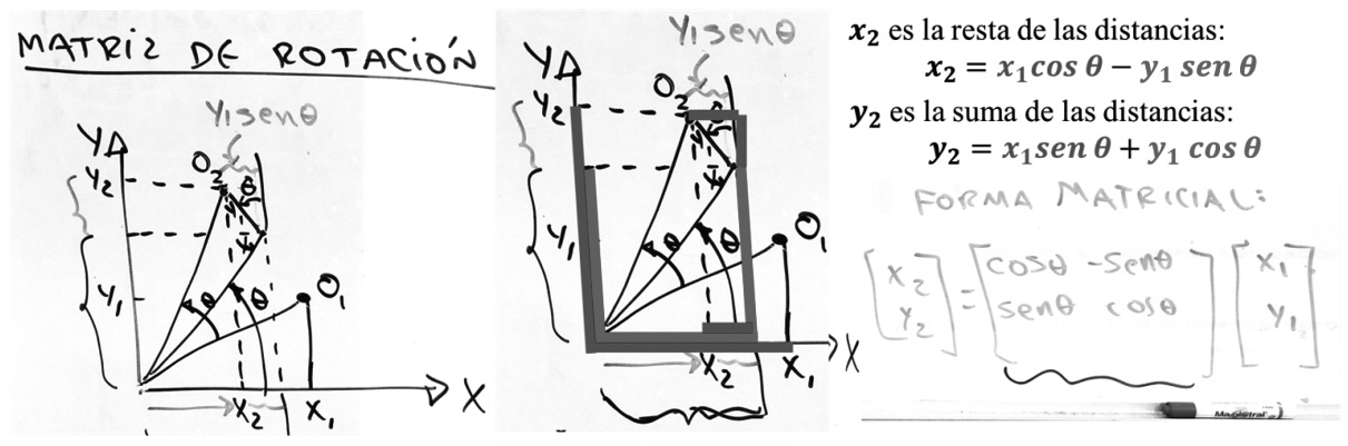 » Desarrollaron la matriz de rotación para el caso bidimensional, a través del análisis del diagrama (fotografía 1) y el establecimiento de las ecuaciones de x2 y y2 con las razones de seno y coseno del ángulo, de donde estudiaron la covariación de la relación cateto-cateto de los triángulos y justificaron que podían emplear las razones porque son triángulos rectángulos.