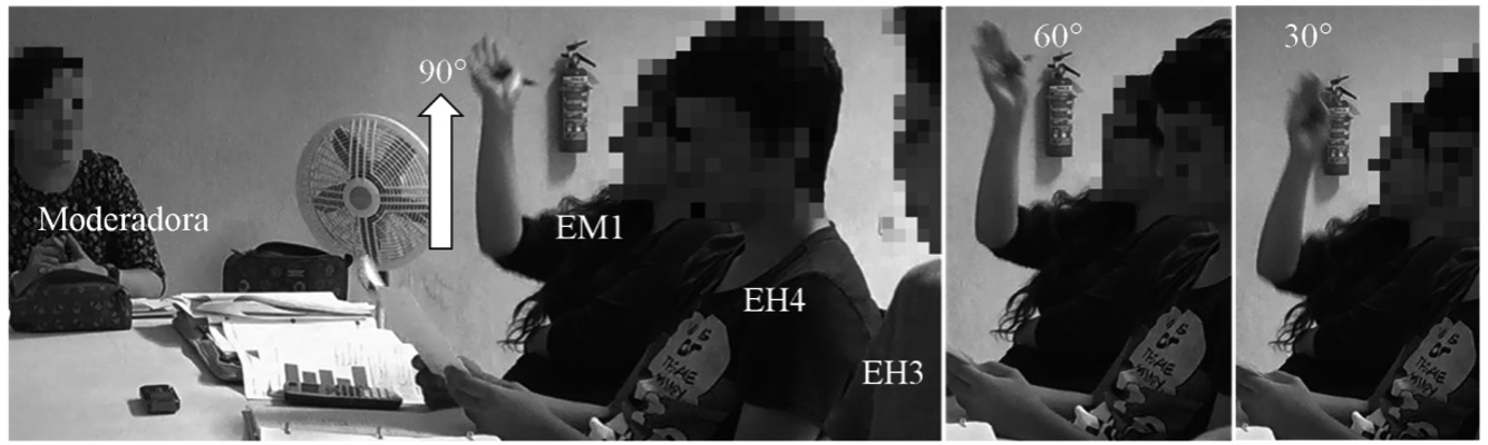 • » EM1. Sí, porque si estuviera del otro lado, ya tuviera su otro eje, ya no fuera igual, y el ángulo que también quieres porque no es lo mismo porque va aumentando (señala con su mano un decrecimiento).