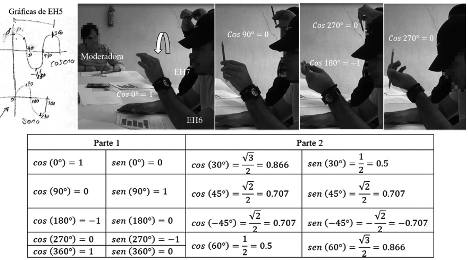 Al realizar operaciones con matrices, tanto el profesor como los estudiantes evocaron de memoria algunos valores de seno y coseno del ángulo: 0°, 30°, 45°, 60°, 90°, 180°, 270° y 360°. Para explorar de dónde reconocen dichos valores, en una entrevista individual se le preguntó al profesor al respecto, quien dijo “tengo en mi mente la imagen del círculo unitario y de triángulos rectángulos para determinar esos valores”. Con la intención de identificar cómo los estudiantes identifican los valores se les solicitó llenar una tabla (Fotografía 4). Para la parte 1 los estudiantes no utilizaron calculadora y explicaron que los valores “provienen de gráficas de funciones de seno y coseno” (ver gráficas de EH5) y de valores del círculo unitario (movimientos con el lápiz de EH6 y EH7). Mientras que para la parte 2 utilizaron la calculadora y dijeron que los valores “se pueden calcular a partir del ángulo que se estudie en el triángulo rectángulo y cuyo signo depende del cuadrante”.