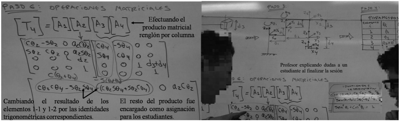 Cuando el profesor explicó problemas de cinemática directa durante las clases, cambió algunos elementos de la matriz de transformación lineal por identidades trigonométricas, según aplicó (Fotografía 5). En los grupos de discusión la moderadora les preguntó a los estudiantes “¿para qué utilizan las identidades trigonométricas? (por ejemplo, cos2 θ + sen2 θ = 1)”, con la intencionalidad de identificar si mencionaban lo que dijo el profesor respecto a su uso en la cinemática directa: “permiten el balance entre el tiempo de la parte mecánica y de control del robot”.