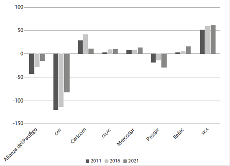De manera opuesta a los dos casos descritos, se encuentra la CAN, cuyo grado de cooperación se considera nulo. El grado de autarquía hidrocarburífera del bloque es alto, dado que sus cuatro miembros (Bolivia, Colombia, Ecuador y Perú) son superavitarios; inversamente, tiene el grado de dependencia externa más bajo de los bloques estudiados, pese a que ha retrocedido nada menos que 38 puntos porcentuales en la década examinada, debido a la acentuada merma de la producción petrolera de Colombia y gasífera de Bolivia. El grado de renovación es medio, aunque cabe notar un importante aumento de más de ocho puntos porcentuales entre 2011 y 2021, gracias al incremento de la capacidad instalada de energías renovables, sobre todo hidroeléctrica en Ecuador. Uno de los objetivos prioritarios de la CAN ha sido la creación de un mercado energético regional y la interconexión eléctrica de sus países y en esa línea nació en 2011 la Iniciativa del Sistema De Interconexión Eléctrica Andina (Sinea). Precisamente, en 2017 se aprobó el Marco Regulatorio para la Interconexión Subregional de Sistemas Eléctricos e Intercambio Intracomunitario de Electricidad a través de la Decisión núm. 816, pero no hace alusión alguna a objetivos de descarbonización o incorporación de energías renovables ( Secretaría General de la Comunidad Andina, 2017). Sólo se encontró una declaración realizada por los países miembros en el marco de la COP26 que tuvo lugar en Glasgow en 2021, en la cual se identifican las oportunidades que representan las energías renovables no convencionales, la movilidad limpia y la eficiencia energética, entre otras alternativas para impulsar una recuperación económica sustentable (CAN, 2022).