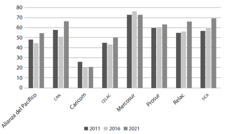 La Alianza del Pacífico es un mecanismo que tiene, en principio, condiciones estructurales para ser autosuficiente y que, no obstante, presenta un nivel de cooperación intermedio. Tres de sus cuatro miembros (Colombia, México y Perú, el otro es Chile) son superavitarios en materia de combustibles fósiles y el grado de dependencia energética es bajo, pese a que Chile y México presentan un saldo deficitario. Al mismo tiempo, estos dos países son los que están más atrasados en el índice de renovación y, en conjunto, el bloque tiene un grado medio que ha ganado seis puntos porcentuales entre 2011 y 2021.