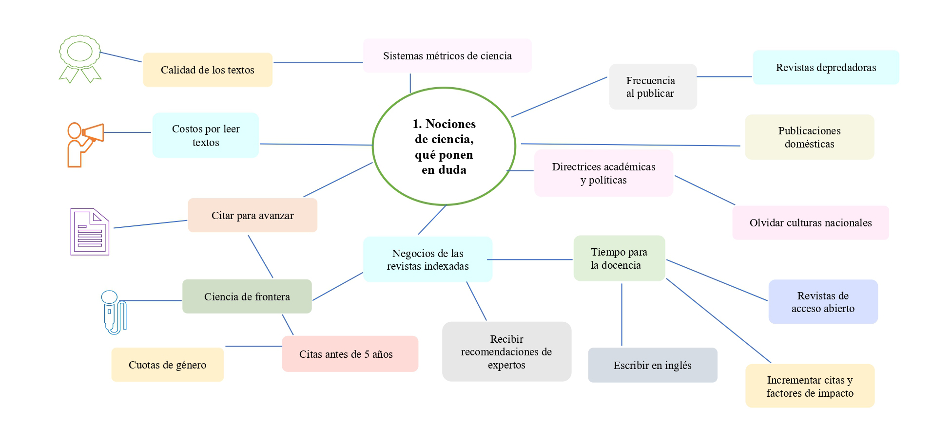 A la vez, algunas de estas nociones trasforman lo que hoy entendemos por conocimiento académico válido, reconfiguran los juegos académicos, económicos y políticos con los que los participantes se comprometen en dicho ámbito cognitivo, excluyen grandes masas de académicos, adicionan costos a tales prácticas, privilegian el idioma inglés mientras rezagan otros, contradicen las culturas y tradiciones nacionales con que se trabajaba en el oficio y elevan las cifras de textos, citas, revistas indexadas y factores de impacto.