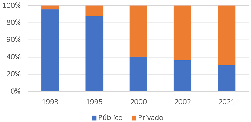 Gráfica 1 Porcentaje de participación pública y privada en la generación eléctrica en Centroamérica, 1993-2021.
