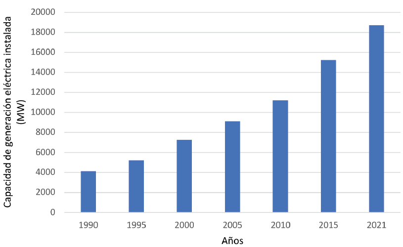 Gráfica 2 Capacidad de generación eléctrica instalada en Centroamérica, 1990-2021.