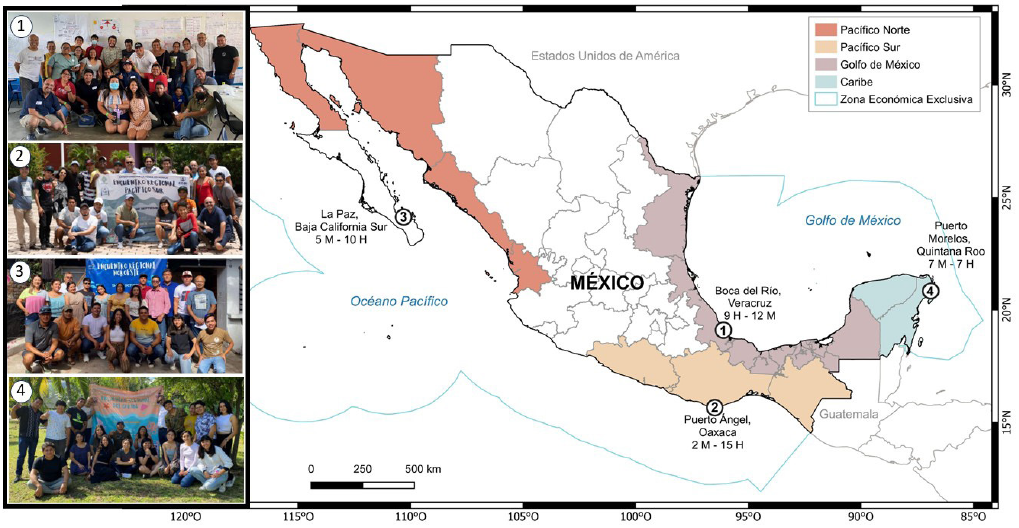 Este artículo da cuenta de una experiencia práctica y concreta construida a partir de cuatro encuentros efectuados en diferentes regiones costeras del país (Golfo de México, Pacífico Sur, Pacífico Norte y Caribe) con jóvenes hombres y mujeres de entre 12 y 29 años de edad que se dedican a la actividad pesquera. Estos encuentros se celebraron entre agosto y diciembre de 2022, con una duración de tres días cada uno (véase en el Mapa 1 la ubicación y participantes por encuentro).