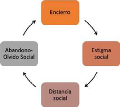 Hasta este punto es posible encontrar una relación consecuente entre el diseño que se atribuye a los encierros con respecto a la forma en que se concibe a las poblaciones que deben y tienen que ser privadas de su libertad, esto en tanto la asignación de un estigma social que les denota autoría sobre las violencias que, desde el crimen organizado, desgastan el tejido social. Sin embargo, en este mismo ensamblaje analítico, destaca la distancia social que se gestiona en torno a las personas acusadas de ser agentes del crimen, misma que es motor del abandono-olvido social experimentado al estar privado de la libertad en los diferentes espacios de encierro. De ahí, que se genere una suerte de ciclo que inicia y acaba con los encierros (Figura 1). Es preciso aclarar que no solo se harán visibles los encierros penitenciarios, sino que aparecerán otros que son también administrados por el Estado.