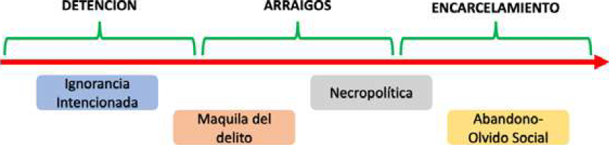 Los alcances que tienen estos ejercicios de poder no se han visto detenidos en el control de la libertad, sino que se desenvuelven otros dispositivos sobre el cuerpo y la determinación de la “verdad”, yendo más allá del simple encarcelamiento. De tal modo, entender el encierro penitenciario pasaría por considerar tres momentos clave: la detención, el encierro no formal y el ingreso a la cárcel. Dando como resultado de este proceso una argamasa compuesta por la ignorancia intencionada, la maquila del delito, la necropolítica y el abandono-olvido social (Figura 2).