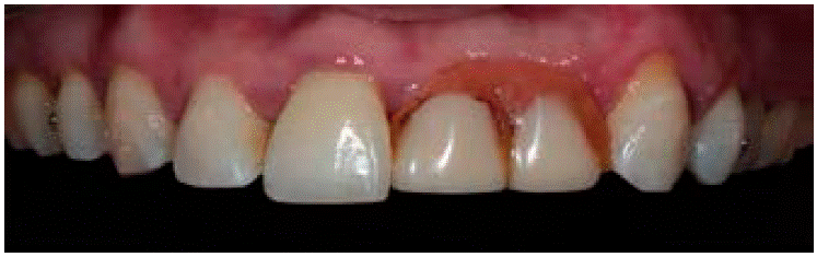 Se decidió retirar la prótesis parcial removible previa a la cirugía y se le colocó un provisional de los órganos dentales 13 al 23 para disminuir tiempos quirúrgicos, favorecer una adecuada higiene y mejorar el aspecto dental de la paciente (Figura 5).