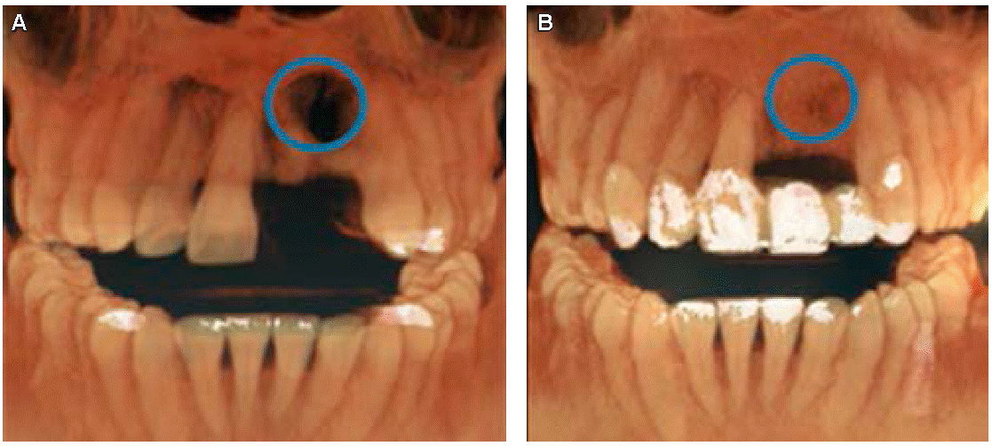La paciente portaba una prótesis parcial removible en mal estado, que involucraba los órganos dentales 21 y 22 como se observa en la Figura 1. Además presentaba un defecto óseo de la cresta de tipo horizontal, clase 1 según la clasificación de Seibert: pérdida de tejido en dirección del vestibulopalatino (grosor) con altura adecuada como se muestra en las Figuras 2AyB.