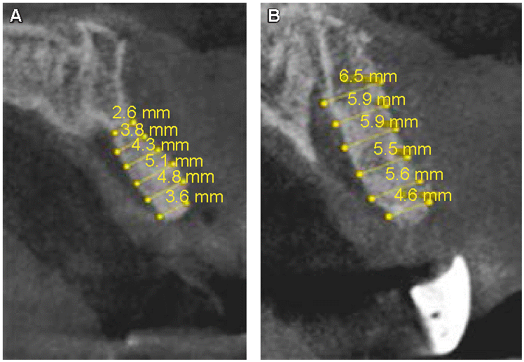 Figura 13: A) Mediciones de la TCHC antes y B) después de la colocación de la lámina ósea para zona del órgano dental 22, corte sagital. (Fuente original).
