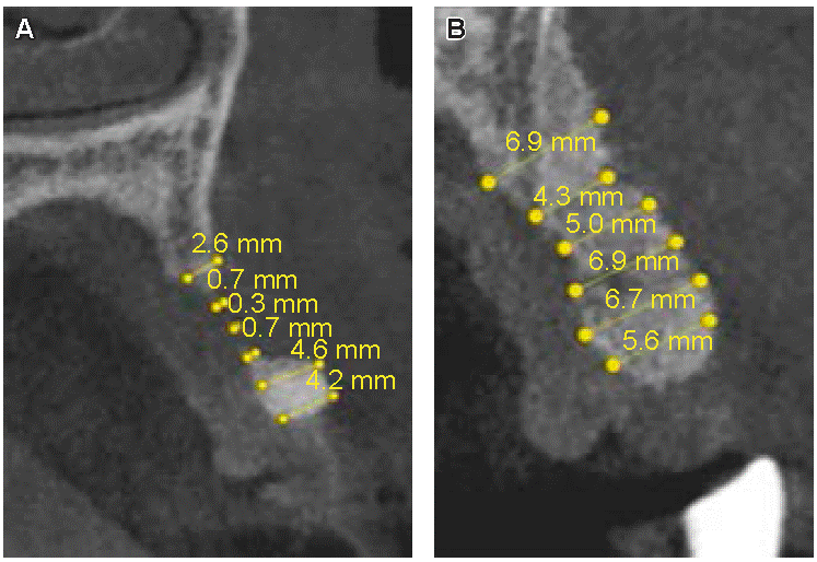 Figura 12: A) Mediciones de la TCHC antes y B) después de la colocación de la lámina ósea para zona del órgano dental 21, corte sagital. (Fuente original).