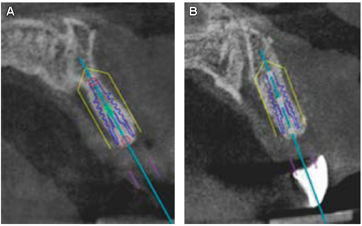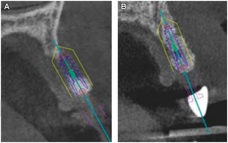 Figura 14: A) Planificación para colocación de implantes antes y B) después de la colocación de la lámina ósea para zona del órgano dental 21, corte sagital. (Fuente original).