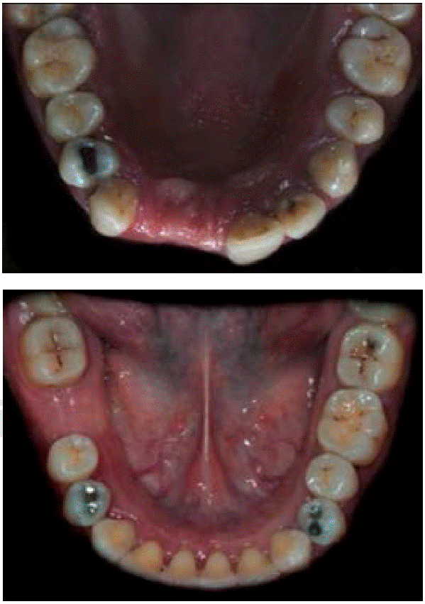 De acuerdo con la nomenclatura de la Federación Dental Internacional (FDI), la paciente tenía caries oclusales en molares y premolares, caries de cíngulo, restauraciones con amalgama, fractura en distal y caries en cíngulo del OD 23 y cuatro dientes ausentes (Figuras 3AyB). De igual forma mostró cálculo dental y tejido gingival inflamado.
