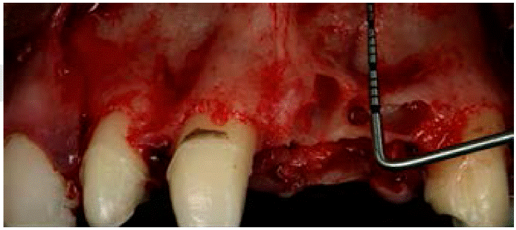 Figura 6: Desprendimiento del colgajo mucoperióstico y observación del defecto óseo. (Fuente original).