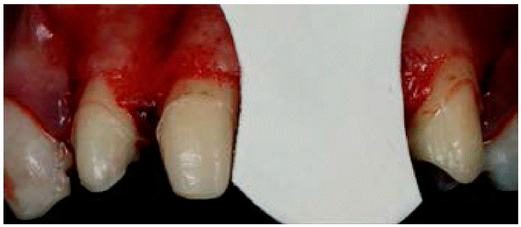 Se realizó un curetaje en la zona receptora, eliminando tejido de granulación con el fin de tener un nicho receptor limpio y un raspado radicular de los órganos dentales adyacentes. Se probó la lámina ósea fina de 25 × 35 mm y se recortó para adaptarse a la zona receptora (Figura 7). Se cribó el tejido óseo en la superficie vestibular del defecto con motor quirúrgico y contrángulo recto con fresa de carburo de bola del número 2 y se irrigó con suero fisiológico. El xenoinjerto Gen-Os se preparó con suero fisiológico estéril en un godete metálico estéril y fue llevado a la zona del defecto óseo (Figura 8). Una vez rellenado el defecto óseo, se liberó el colgajo hasta que llegara al tercio incisal de los órganos dentarios 12, 11 y 23. A continuación, se hidrato la lámina ósea durante aproximadamente cinco minutos en solución fisiológica hasta obtener la consistencia de plasticidad deseada. Fue adaptada en la zona receptora (Figura 9) y fijada e inmovilizada con sutura de aguja triangular no traumática Vicryl 4’0s. Se realizó la síntesis de los tejidos suturando con Nylon 4’0s empleando la técnica de colchonero vertical y algunos puntos de sutura simples. También se hizo un lavado con suero fisiológico y se limpió la zona quirúrgica con gasas estériles. Se ajustaron provisionales de tal manera que los pónticos no contactaran con la zona en regeneración.