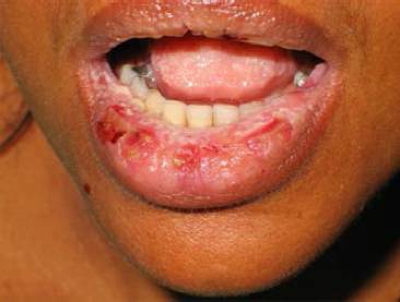 Clinically, head, neck, face, and limb injuries were observed; in the mouth, they were located on the lips, tongue, jugal mucosa, and palate. These lesions were ulcerated, painful, erythematous, bleeding to the touch, and some bullous (Figures 1and2).