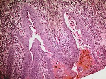 Incisional biopsies of the oral lesions were performed, and the diagnosis was blistered with suprabasal acantholysis, which is compatible with pemphigus vulgaris (Figure 3). Histological sections showed a typical intraepithelial cleft, with rounded acantholytic epithelial cells located within the cavity. A moderate underlying infiltration of inflammatory cells was observed. Tests were made for the research of autoantibodies, with negative results.