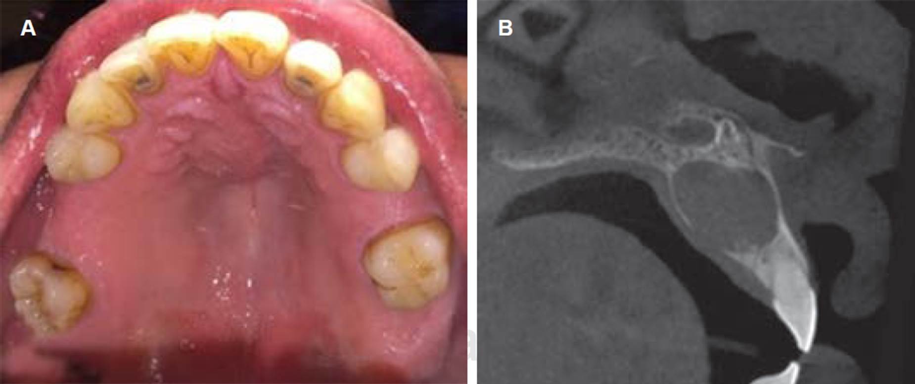 Figura 1 A) Imagen intraoral clínica de lesión a nivel de paladar duro. Se observa tumoración redondeada, no ulcerada y mucosa de coloración normal en la parte anterior del maxilar relacionada con los incisivos anterosuperiores. B) Examen imagenológico CBCT corte sagital; se observa lesión quística que genera expansión de corticales vestibular y palatina, asociada a mesiodens invertido, proyectado en cavidad nasal.
