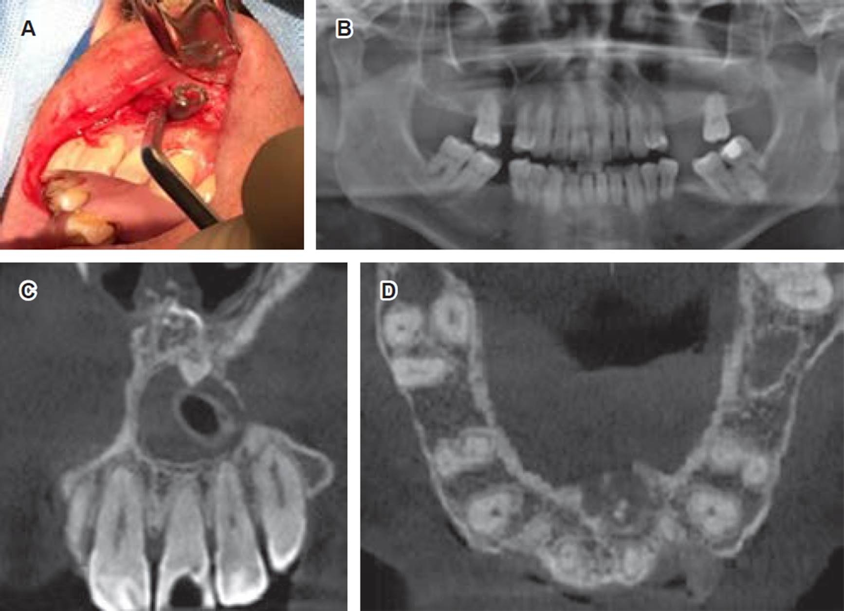 Figura 2 A) Biopsia incisional de lesión quística. Se observa instalación de cánula de descompresión e irrigación. B-D) Exámenes imagenológicos de control a los seis meses posterior a descompresión. B) Ortopantomografía; se observa lesión radiolúcida a nivel anterosuperior con cánula de descompresión. C) CBCT corte coronal, se observa lesión quística con cánula en su espesor y mesiodens invertido el cual se proyecta entre cavidad oral y nasal. D) CBCT corte transversal, se evidencia conducto nasopalatino desplazado por lesión quística y aumento de volumen palatino.